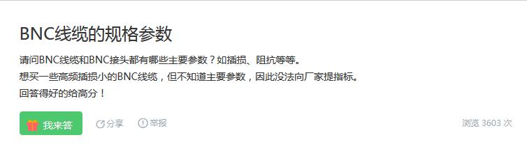 在百度問答上,有一個用戶詢問了一些關于bnc線纜與bnc接頭規格參數的相關問題,下面德索五金電子就將此則問答信息做了一個歸整,分享給用戶查閱。