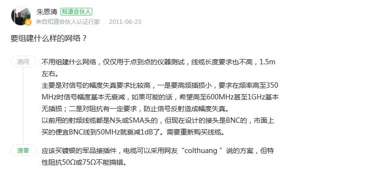 不用組建什么網絡,僅僅用于點到點的儀器測試,線纜長度要求也不高,1.5m左右。主要是對信號的幅度失真要求比較高,一是要高頻插損小,要求在頻率高至350MHz時信號幅度基本無衰減,如果可能的話,希望高至600MHz甚至1GHz基本無插損;二是對阻抗有一定要求,防止信號反射造成幅度失真。以前用的射頻線纜都是N頭或SMA頭的,但現在設計的接頭是BNC的,市面上買的便宜BNC線到50MHz就衰減1dB了。需要重新購買線纜。