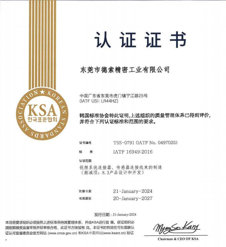 ??東莞市德索精密工業有限公司(以下簡稱“德索精密”)擁有?KSA(韓國標準協會) 審核頒發的 IATF 16949:2016 質量管理體系認證。德索精密在視頻系統連接器與傳感器連接線束的制造領域,已經完全具備了為全球汽車產業鏈提供高標準、高可靠性產品的硬核實力!